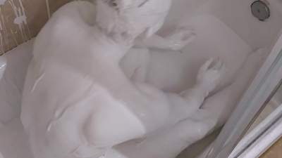 Bum is having fun covering himself with a pale of white wall paint. He is all white from head to toe as he rolls around in the bathtub full of paint!